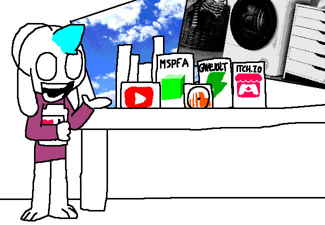 Back at the prior area, he goes back to showing you stuff, including some HOME VIDEOS, ADVENTURE BOOKS, MUSIC CDs, and VIDEO GAMES. He's also showing you pictures with labels that read "BLUE SKIES" and "TUMBLE DRIER," and has a TIP JAR in his paws.Once again, he tells you that he's nowhere near a place called "X, formerly known as Twitter." You already know this statement well.Anyways, he tells you can you can do any of these things, and that you could always go back to listening to him ramble on about himself.